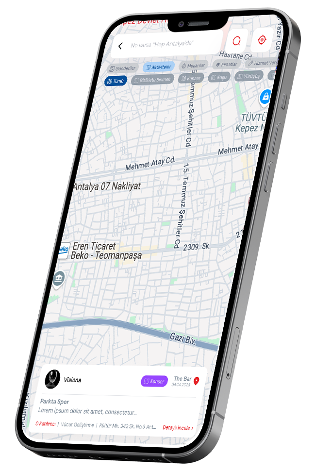 Harita üzerinden mekanları, etkinlikleri, indirimleri keşfet. Antalya’yı yeniden tanı!